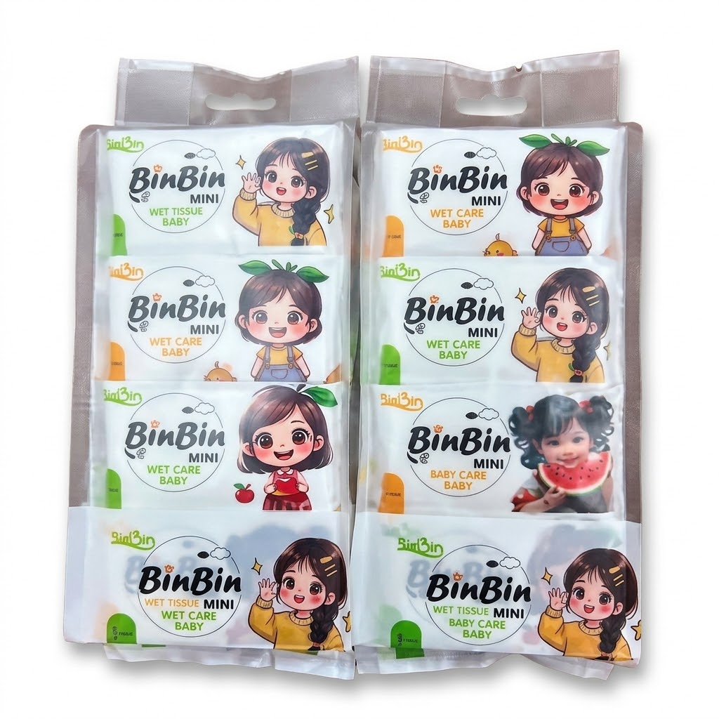 KHĂN ƯỚT MINI BINBIN LỐC 8 GÓI – NHỎ GỌN, TIỆN LỢI MANG THEO MỌI LÚC